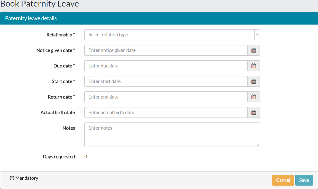 - The Book Paternity Leave page will open, allowing you to enter your paternity leave details.