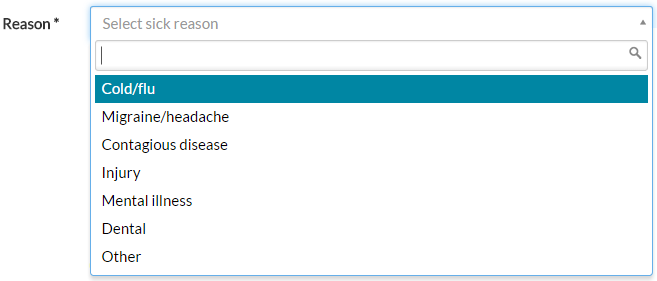 - From the Reason drop-down menu, select the nature of your sickness. These are pre-defined values set by your company/system administrator.