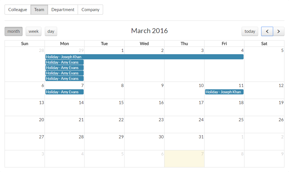 - The Calendar will load, starting with the Colleague view as a default, showing the current month and highlighting the current day in yellow.