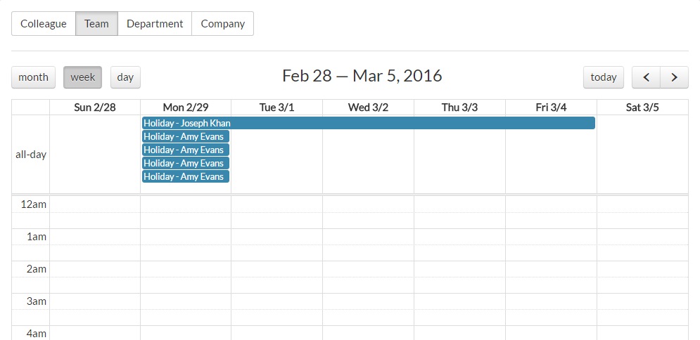 - Selecting the day view shows the selected day and any leave during that day, similar to the example below.