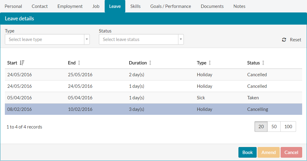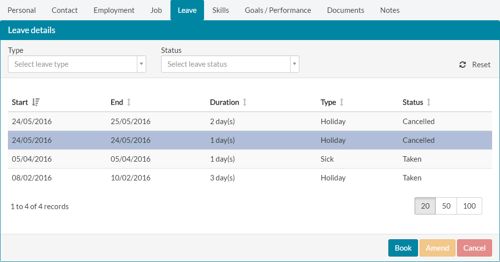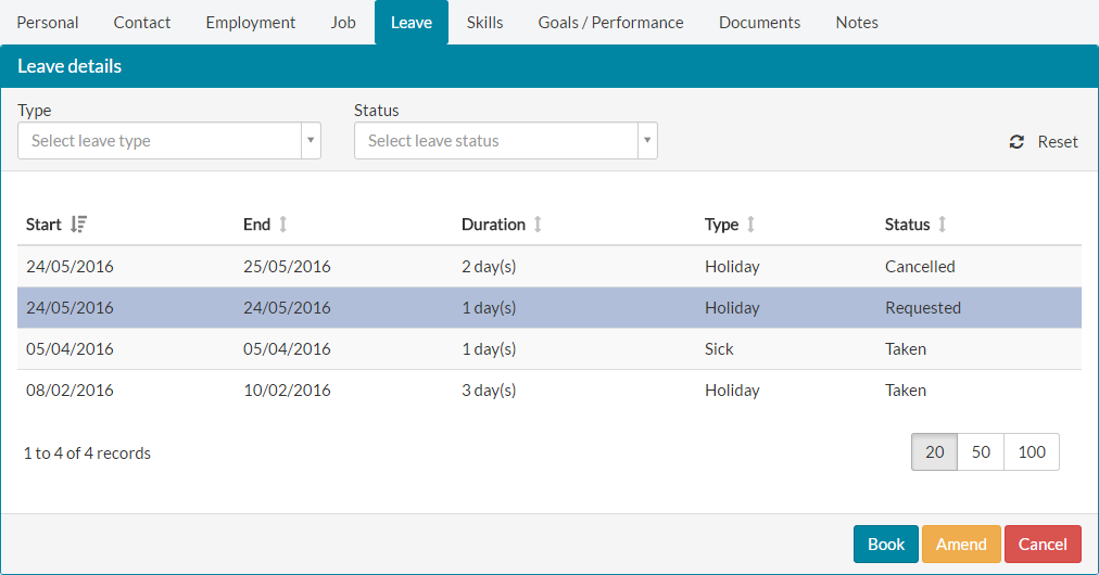 Leave tab under My Details. - Using any of the methods mentioned above to access your leave information, will display a table of your leave, similar to the table above.