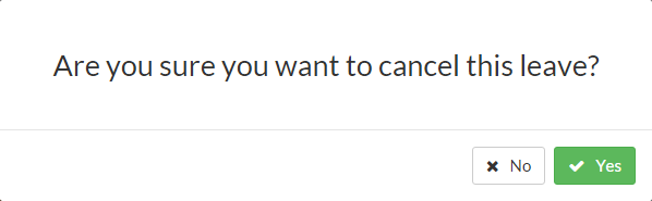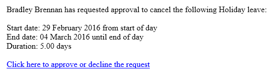 Cancelling requested or approved leave yet to be taken, is quickly marked as cancelled and updates your leave allowance information immediately. Cancelling leave with a status of taken, sets this to cancelling and requires approval by your team leader/manager, who will receive an email notification that you have cancelled the leave.
