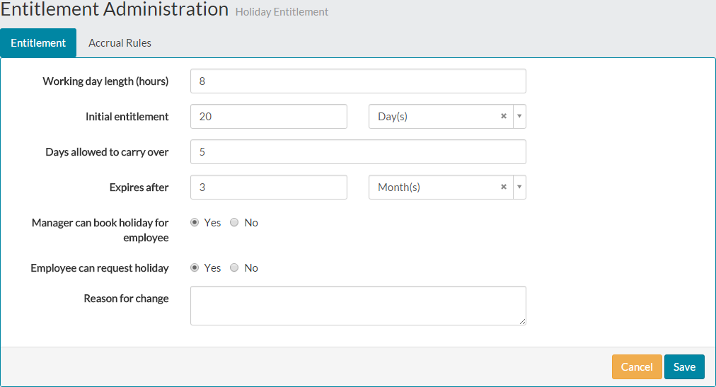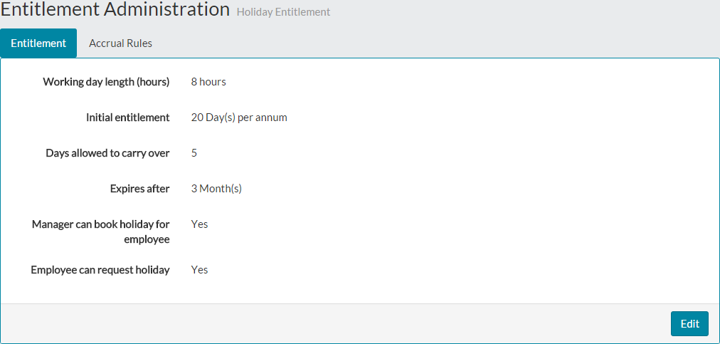 - On the entitlement tab, you can set your organisation working day length in hours, the default initial entitlement applied to joiners, configure carried leave details and amend what employees and managers can do.