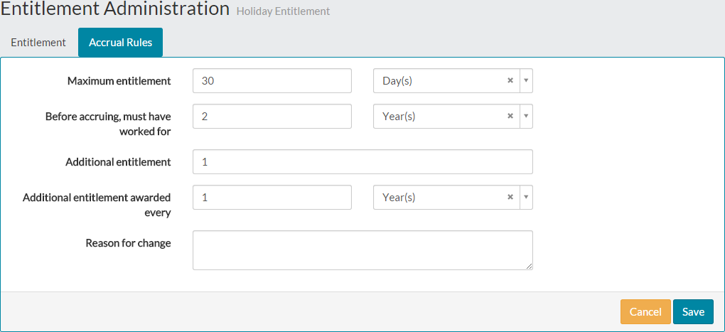 - Before accruing, must have worked for – The number of day(s), week(s), month(s) or year(s) an employee must be employed, before being awarded additional entitlement, as per your accrual rules here.