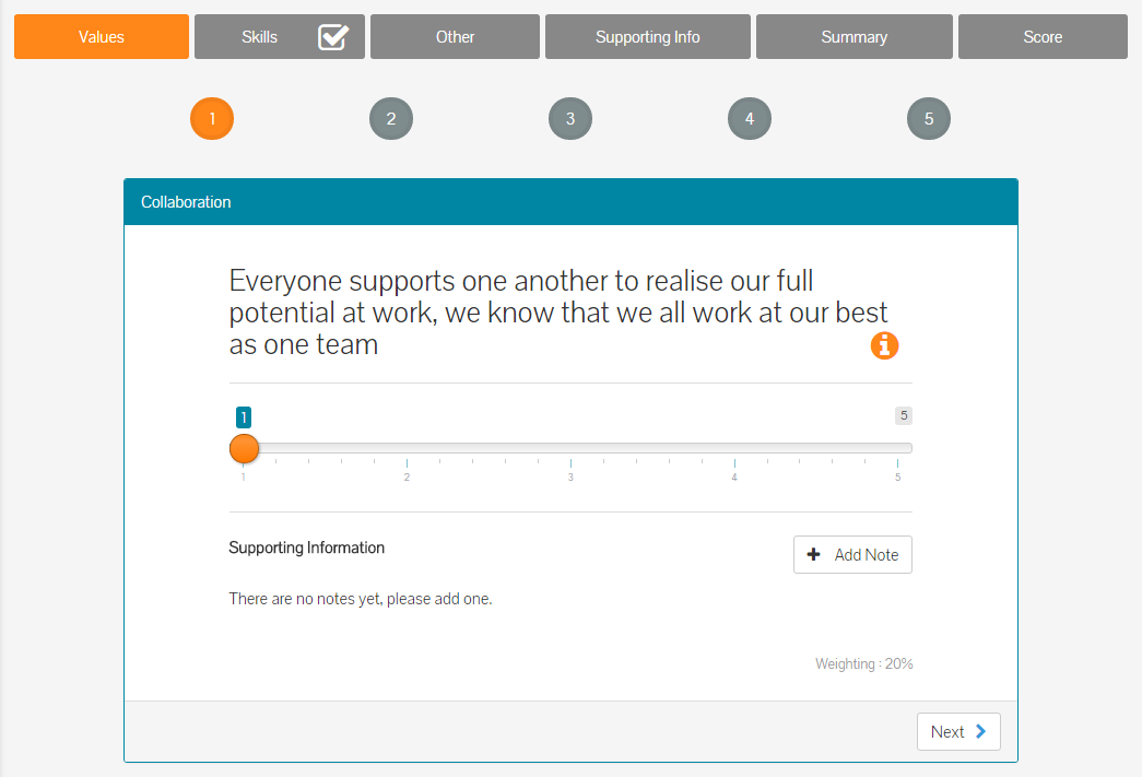 - In the example above, the ‘numeric slider’ method to review performance against a goal is being used and there are five goals to be measured against.