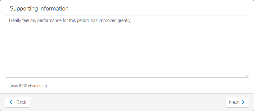 - On the Supporting Info tab, you can add some information regarding the review or your performance for the period being reviewed. Although this section has a 1000-character maximum, this is a good opportunity for you to provide your supervisor with some more information about your responses and overall performance review.