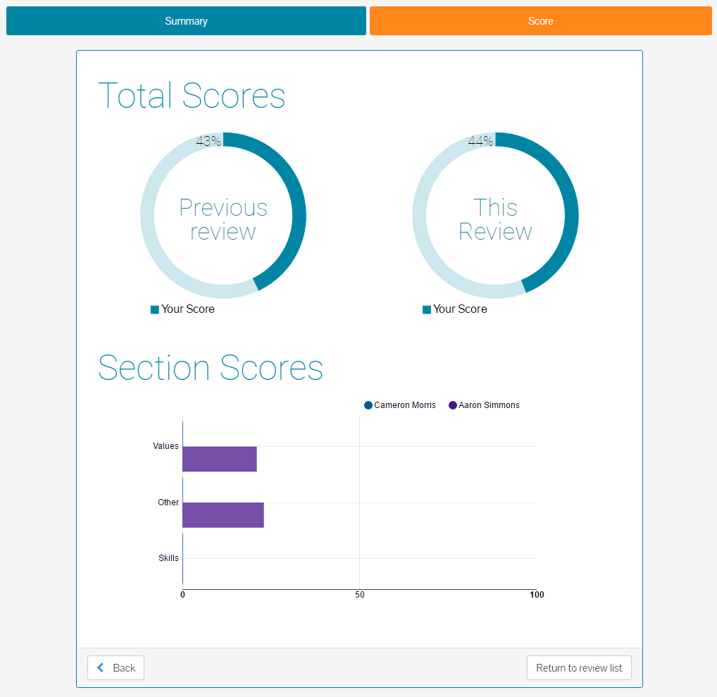 - You will also see the Score tab, after submitting your review, which is a comparison between this review and your previous review. This also shows a breakdown of each section and its corresponding score.