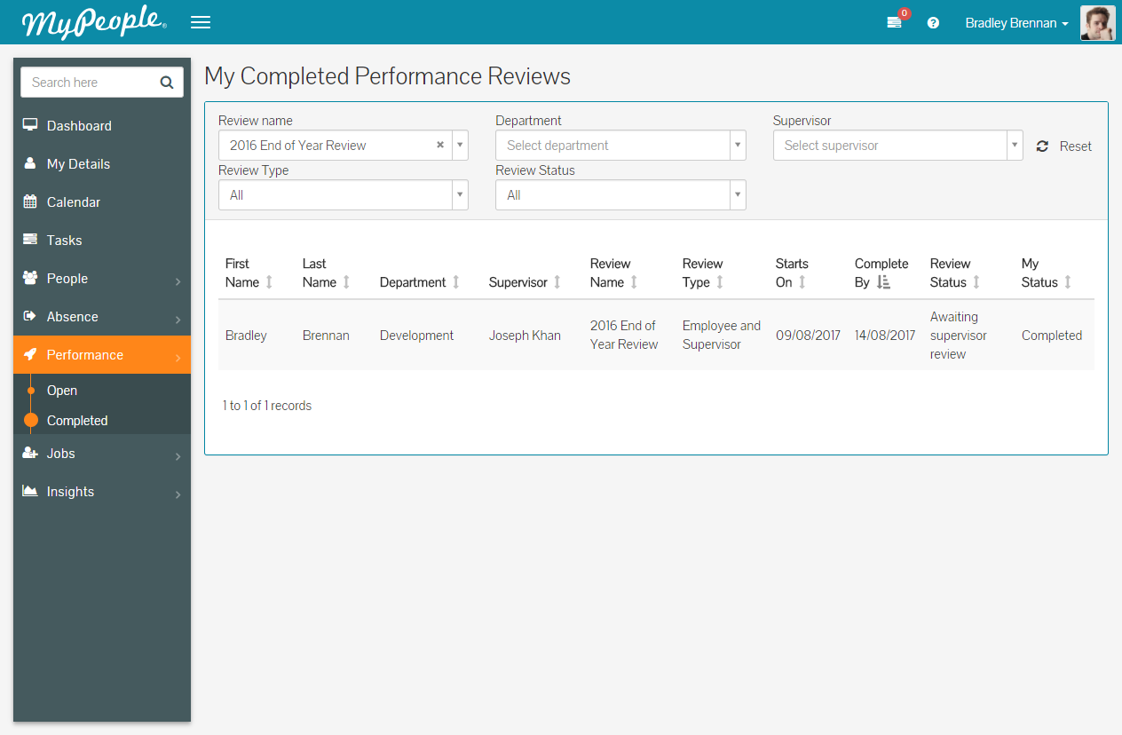 - From the Completed sub-menu, you’ll be able to search for and check the status of your review. In the example below, we can see that the status is ‘Awaiting Supervisor Review’, meaning that your supervisor / line manager is yet to start their side of the review.