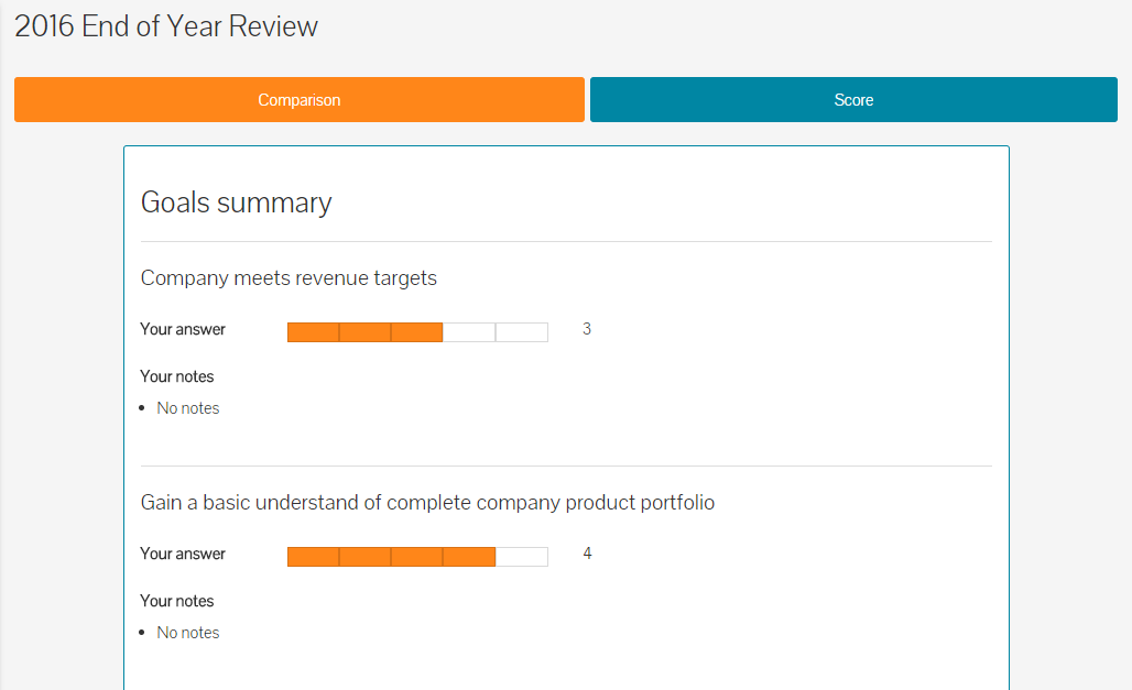 - Also, when clicking on your completed review, you can look at your comparison and score, and your supervisor’s score when complete.