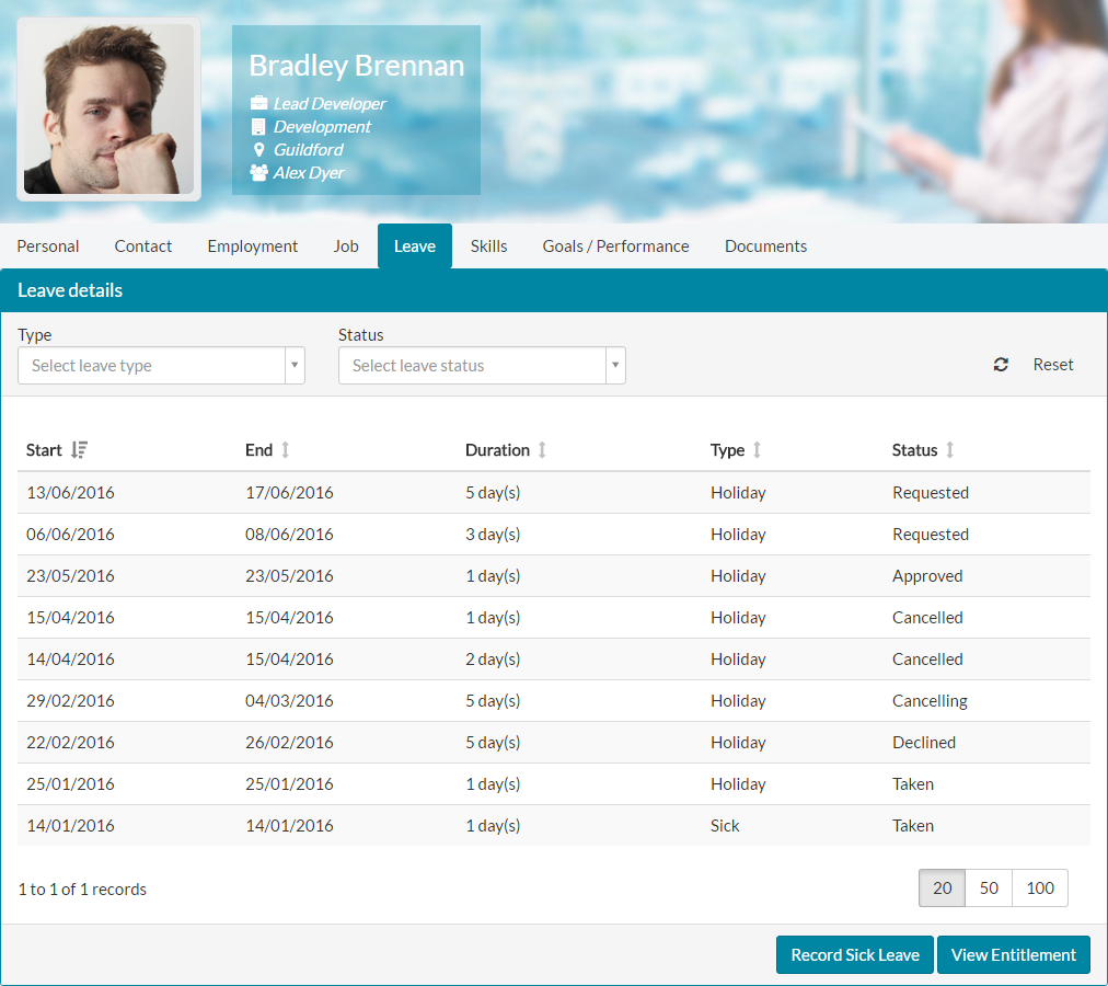 - In this example, Bradley has changed his role and team within the organisation. With this change, Bradley also benefited from an increased entitlement of four days, taking him from 20 to 24 days leave per year.