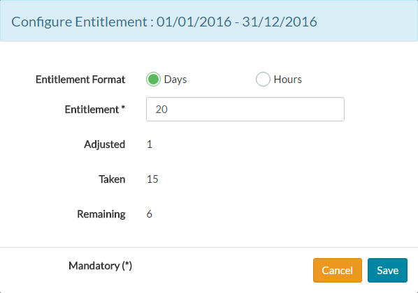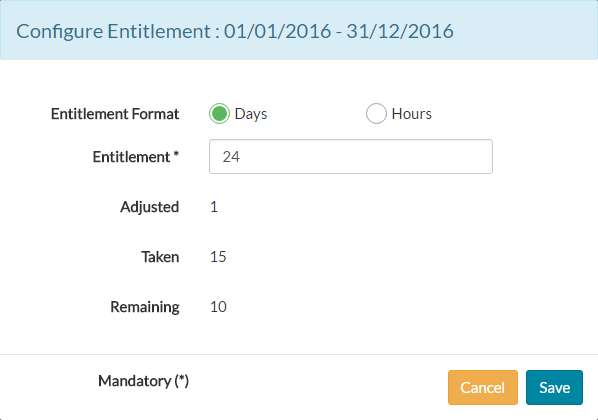 - To set the initial entitlement for the employee for the given period, manually type number of days/hours or use the field controls to increase/decrease the entitlement amount.