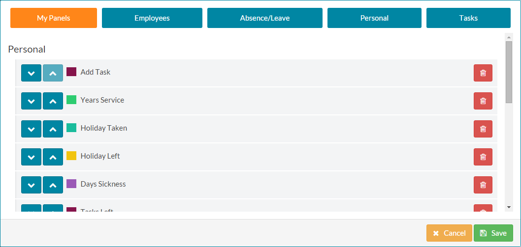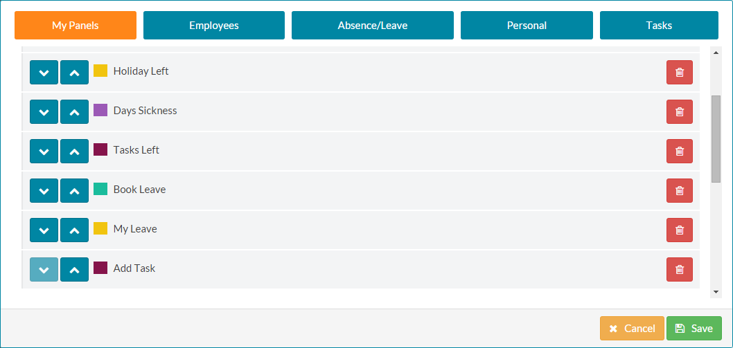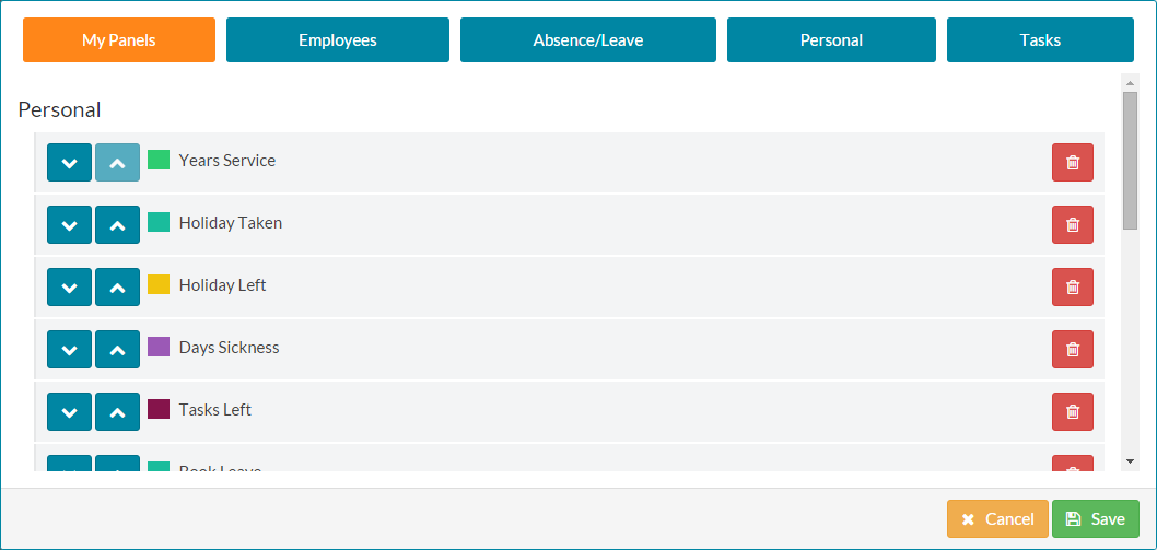 - Complete the process for any panels you wish to re-organise. This also applies to Colleague, Team and Company dashboard sections.