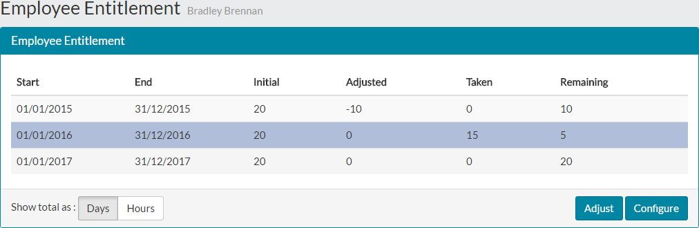 - You’ll be returned to the Employee Entitlement screen, where you can see the newly adjusted remaining entitlement in the table for the entitlement period.