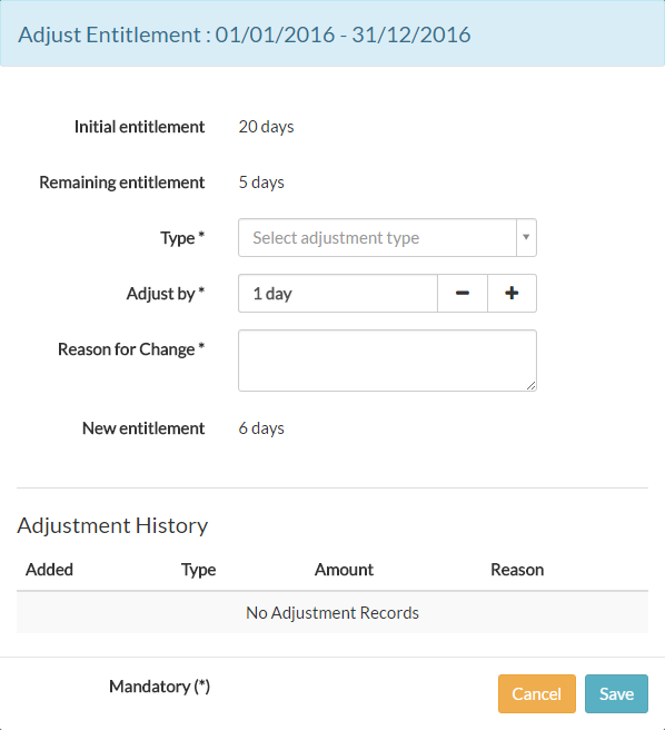 - Click adjust with the selected row highlighted and the Adjust Leave Entitlement form will be displayed.