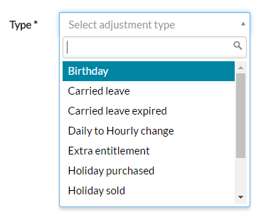 - Select a type of adjustment from the dropdown menu, which could be for holiday purchased or sold, an extra day for the employee’s Birthday or time off in lieu.