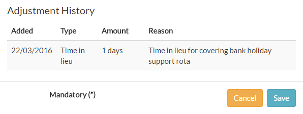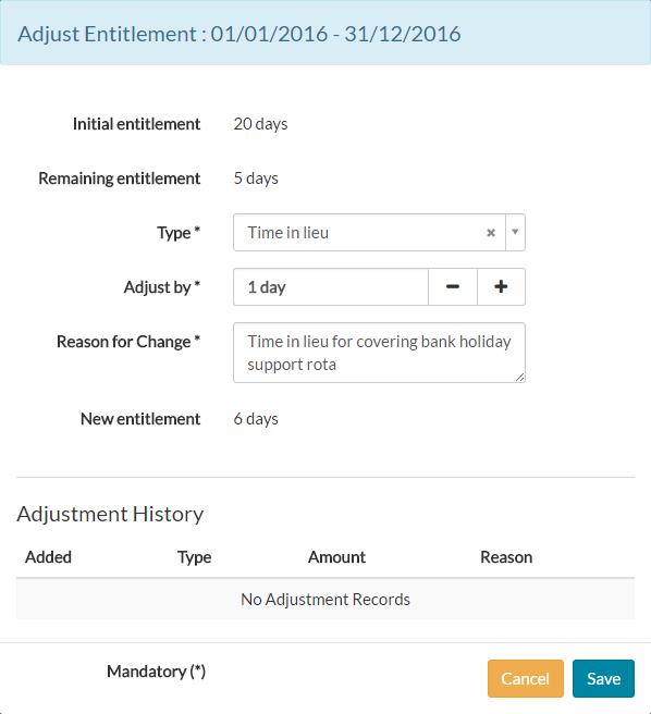 - Add a reason for the change, which will be added to the adjustment history section below the entitlement adjustment options.
