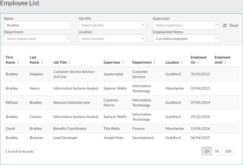 - Using the table filter controls, you could search for an employee by name, by entering part or all of their name in to the search field. The table will be updated automatically, to show only the results matching your search criteria.
