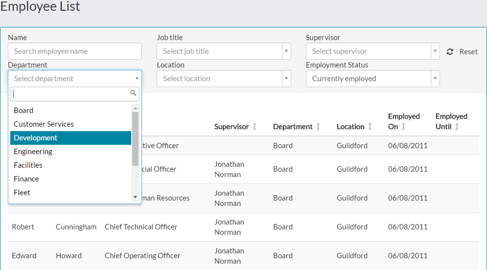 - You could also use the drop-down menu on the other filters, to show employees within a certain department or location, who have a particular job title or who are managed by a certain supervisor