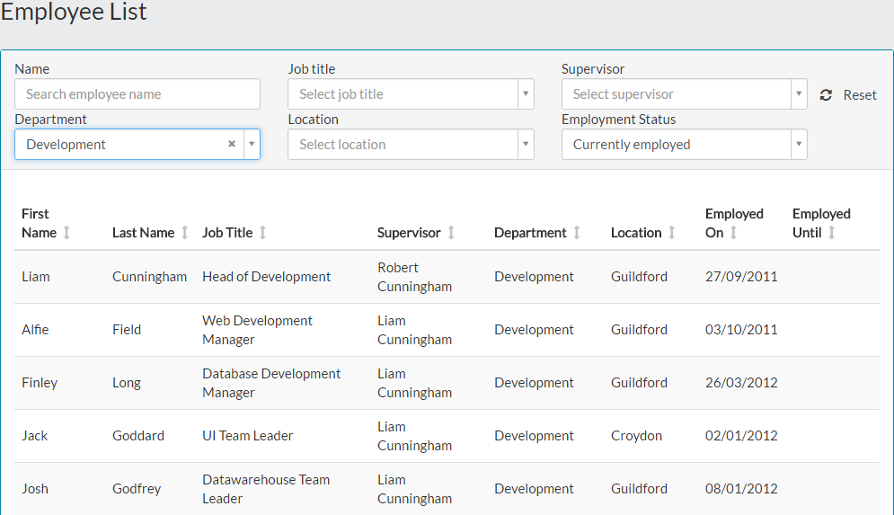 - Using one of the filter drop-down menus, the table is updated to show any matching employees accordingly.