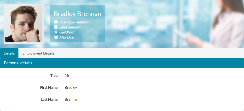- Clicking on an employee from any filtered table of results, will load their employee record, similar to the example below.