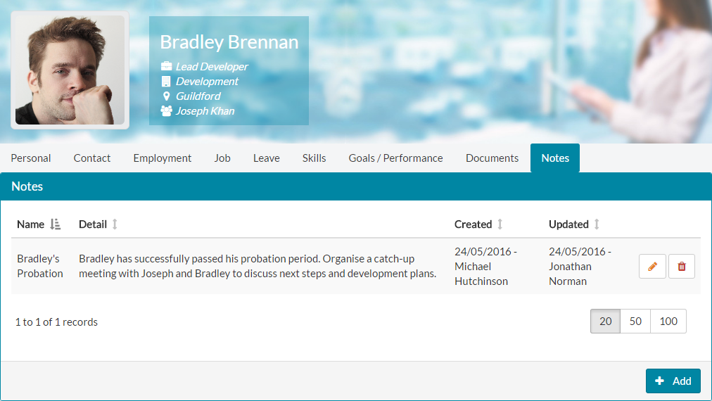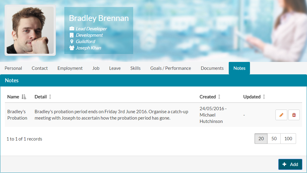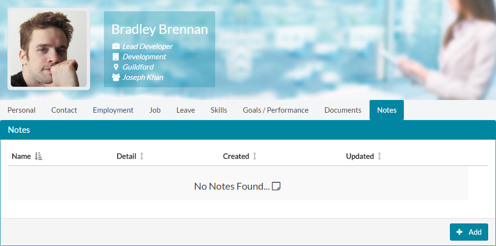 Notes are added, edited or deleted under the employee record for the corresponding employee, using the Notes tab and are available against all employees.