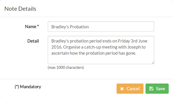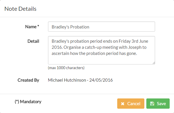 - Employee Notes can be edited by anyone who has the required role. This could be the team leader/manager of the employee and any HR or Customer administrator. These could be their own added notes, or those added by others with the required role.