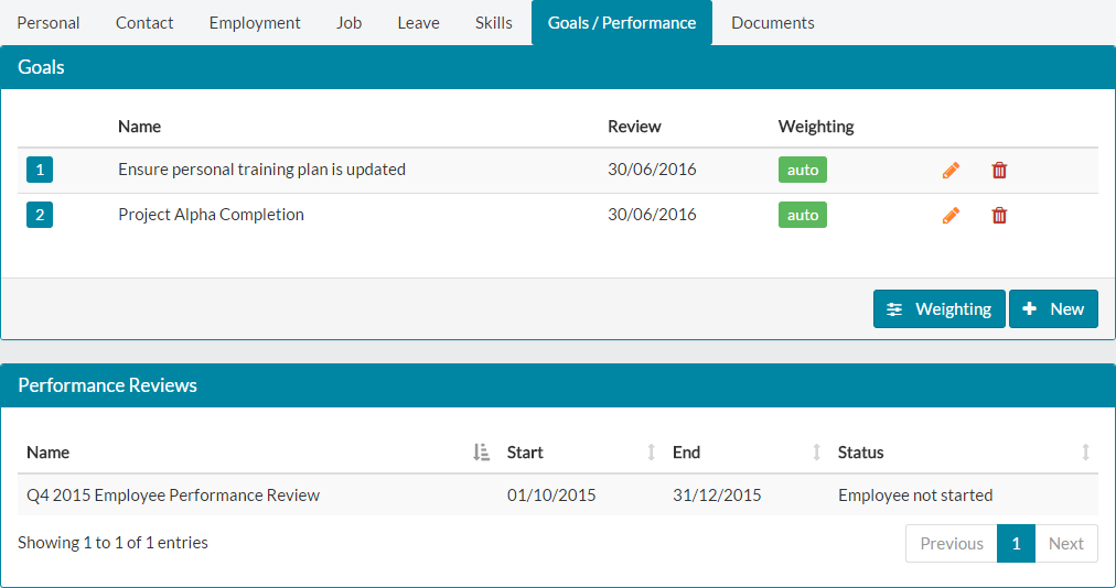 The Goals / Performance tab of My Details, shows your current goals set by your manager and an historical list of your performance reviews.