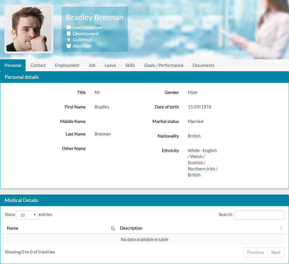 My Details is your personal employee record and where all of your employee details are stored. These include contact and salary details, as well as leave and goals/performance.