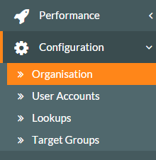 - Logged in as an administrator, you can access Organisation settings by clicking the Configuration side menu, followed by the Organisation sub-menu.