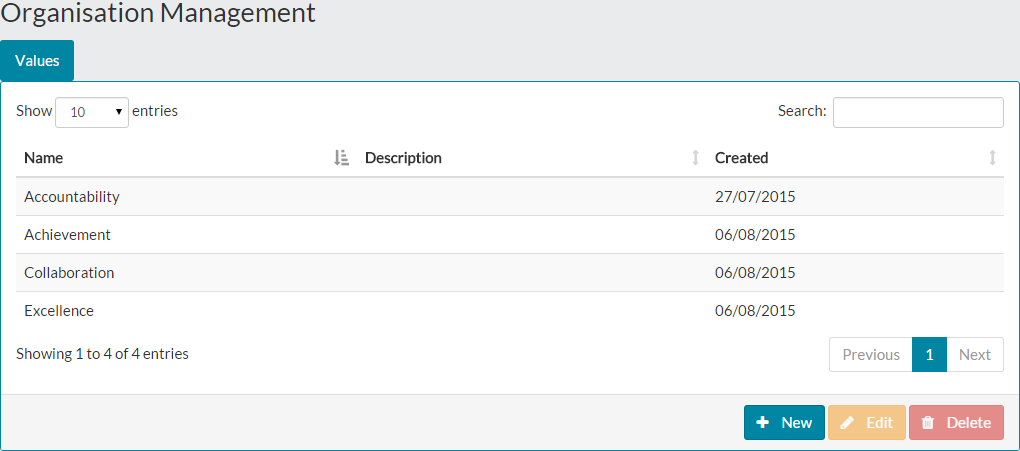 - Each organisation-wide configuration will be represented by a tab within the Organisation Management screen, as shown above with the Values tab.