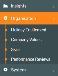 - To create, amend or remove company values, logged in as an administrator, first click Organisation from the side menu, followed by the Company Values sub-menu.