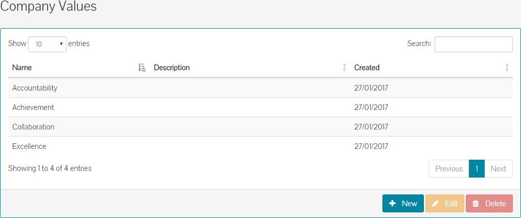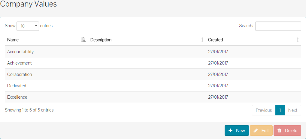 - Click save and your new company value will show in the table of company values.