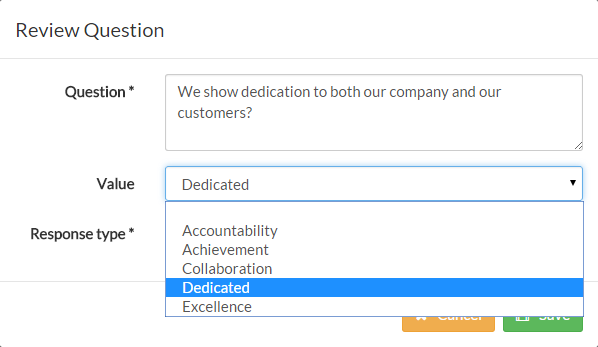 You can add, edit or remove company values from within MyPeople and then these can be used to when adding sections/questions to a performance review configuration.