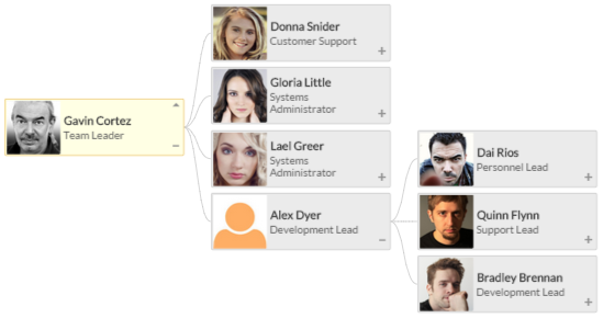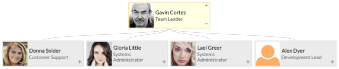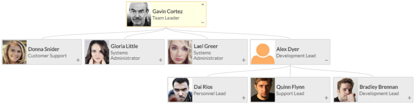 - Clicking the + symbol on the bottom of Alex’s panel, will display direct reports of Alex as well.