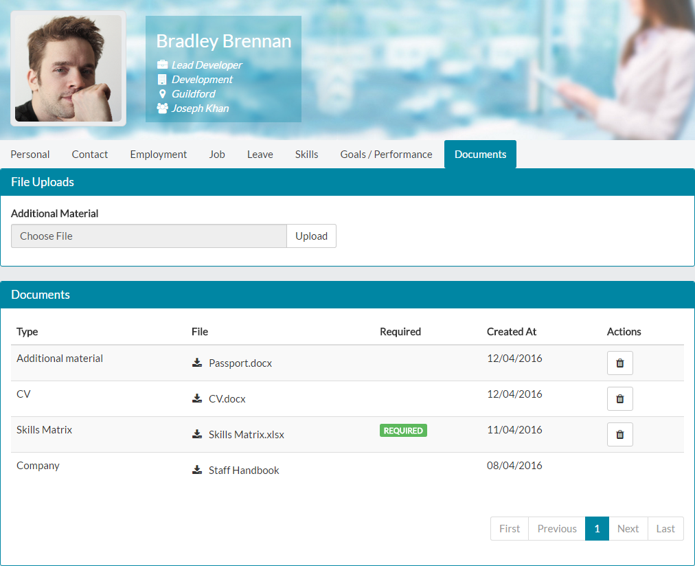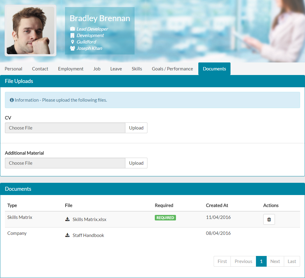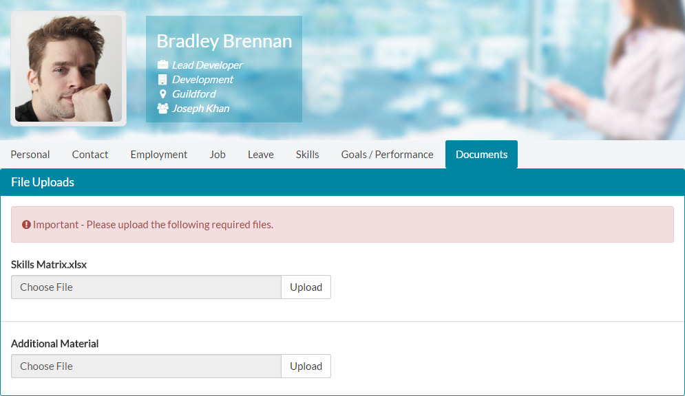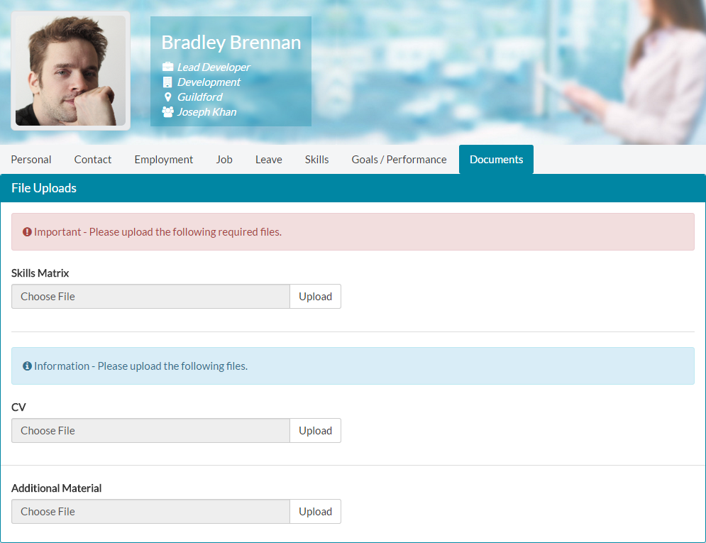 - Lastly, Bradley can upload Additional Material. This gives him a chance to upload any documents he feels relate to his employment, that he wishes to be available against his employee record. Only Bradley, his line manager and Hr/Customer admins can see the documents under Bradley’s employee record.