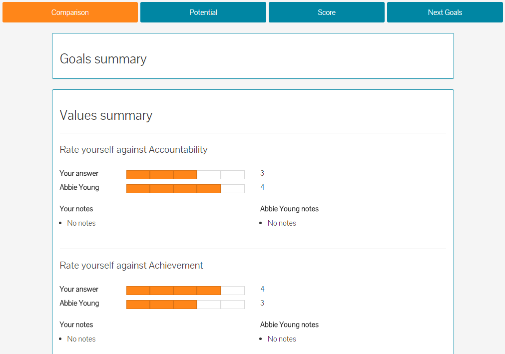 - If the review is currently marked as ‘completed’, clicking the review from within the table will take you to a review comparison page, whereby you can view the review scores that both you and your team member gave, as well as being able to print or download this review.