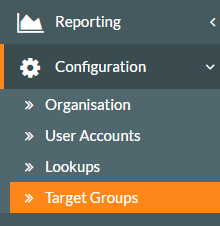 - To create, amend, delete or view existing target groups, logged in as an administrator, click on the Configuration side menu, followed by the Target Groups sub-menu.