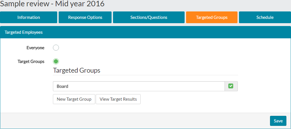 For example, you could create a target group that has two filters, which are ‘Department = Sales’ and ‘Gender = Male’. This will group all males within the Sales department together. You could then create a performance review, specifically designed for this group.