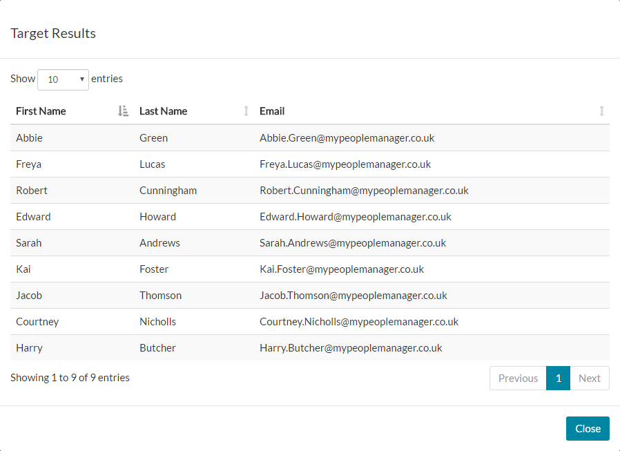 - Selecting an existing target group in the list by checking the box next to the group as shown above, you can view the results of this by clicking ‘View Target Results’. This is a way of checking who will be targeted as part of this performance review.