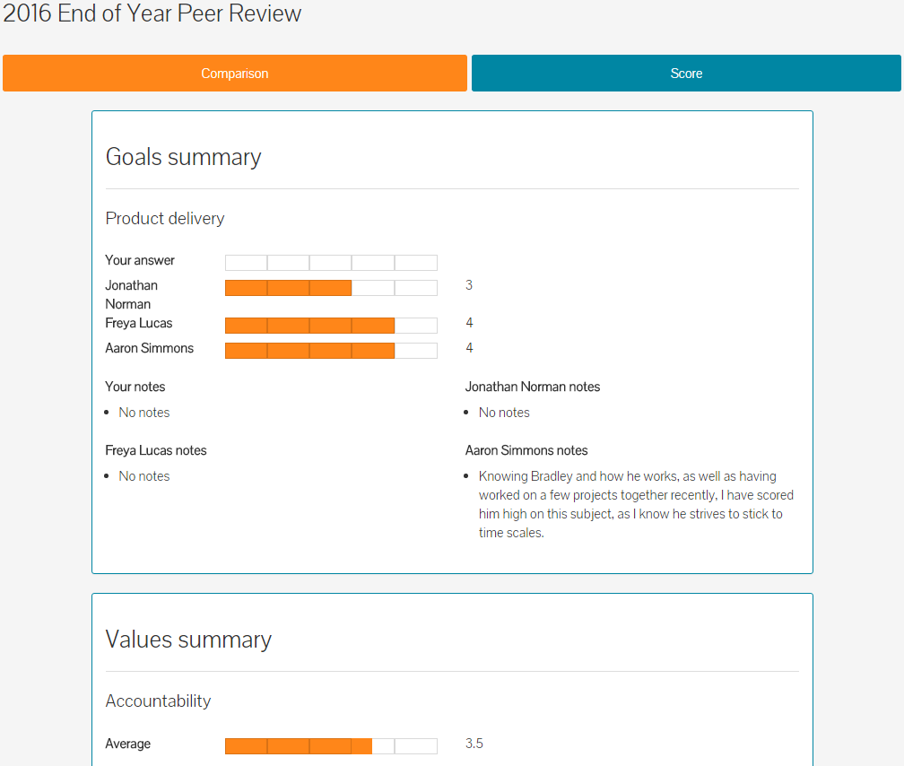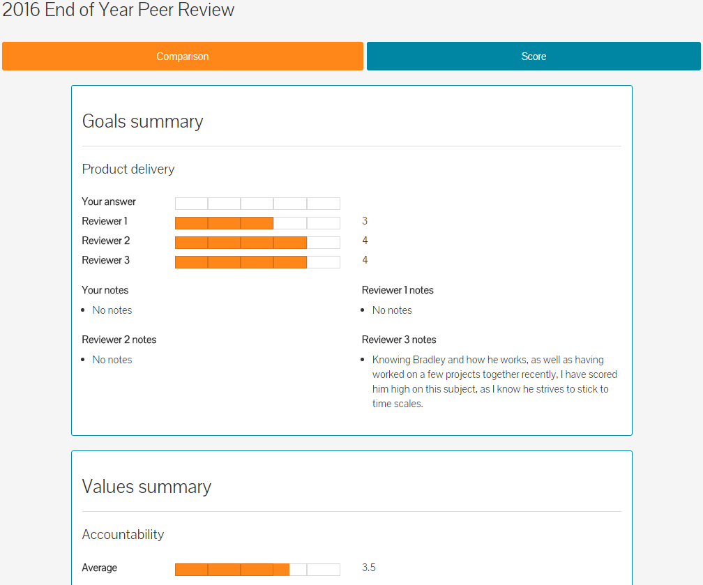 - HR Administrator (peer reviewer) – As an HR administrator, you can view all reviews scores and additional notes on each question, or section, including your own.